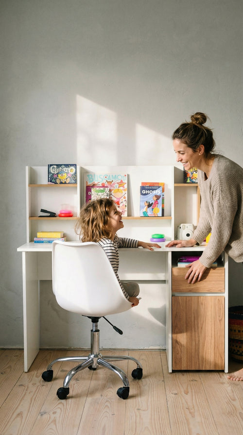 El Escritorio TREINA es único, con un panel decorativo para desplegar tu creatividad y una amplia mesa de trabajo para que no tengas que preocuparte por el espacio.